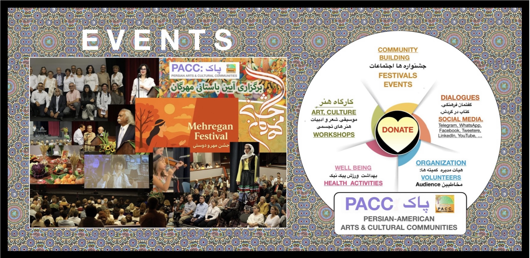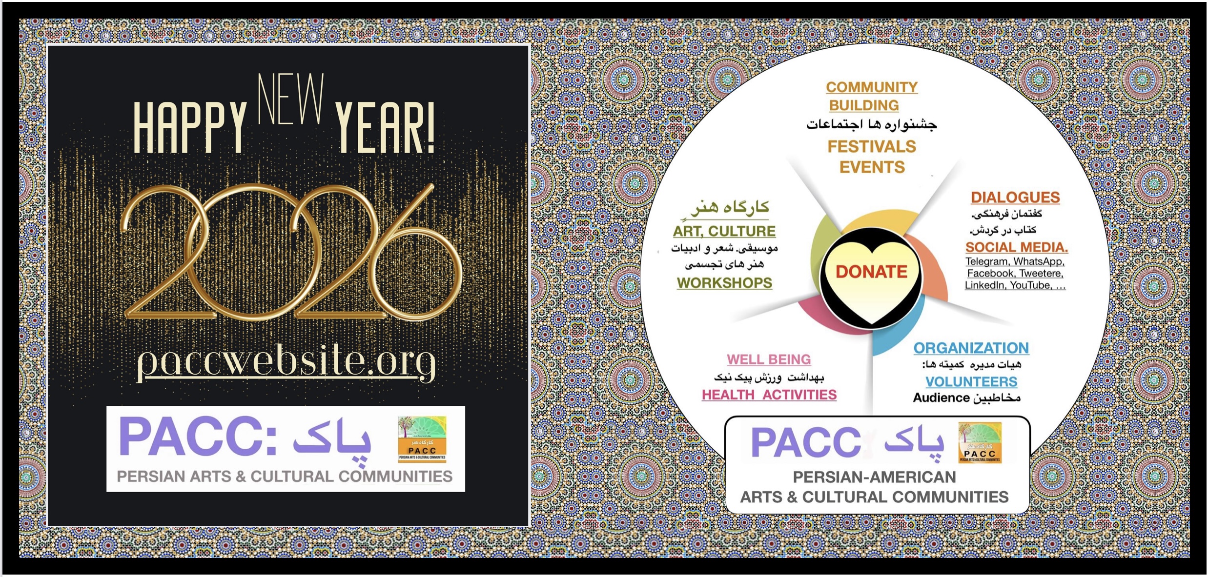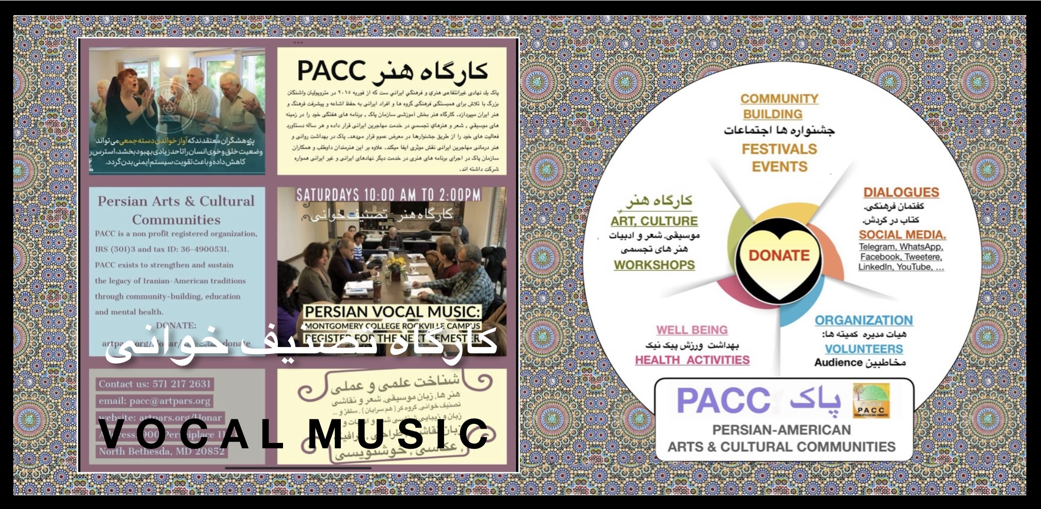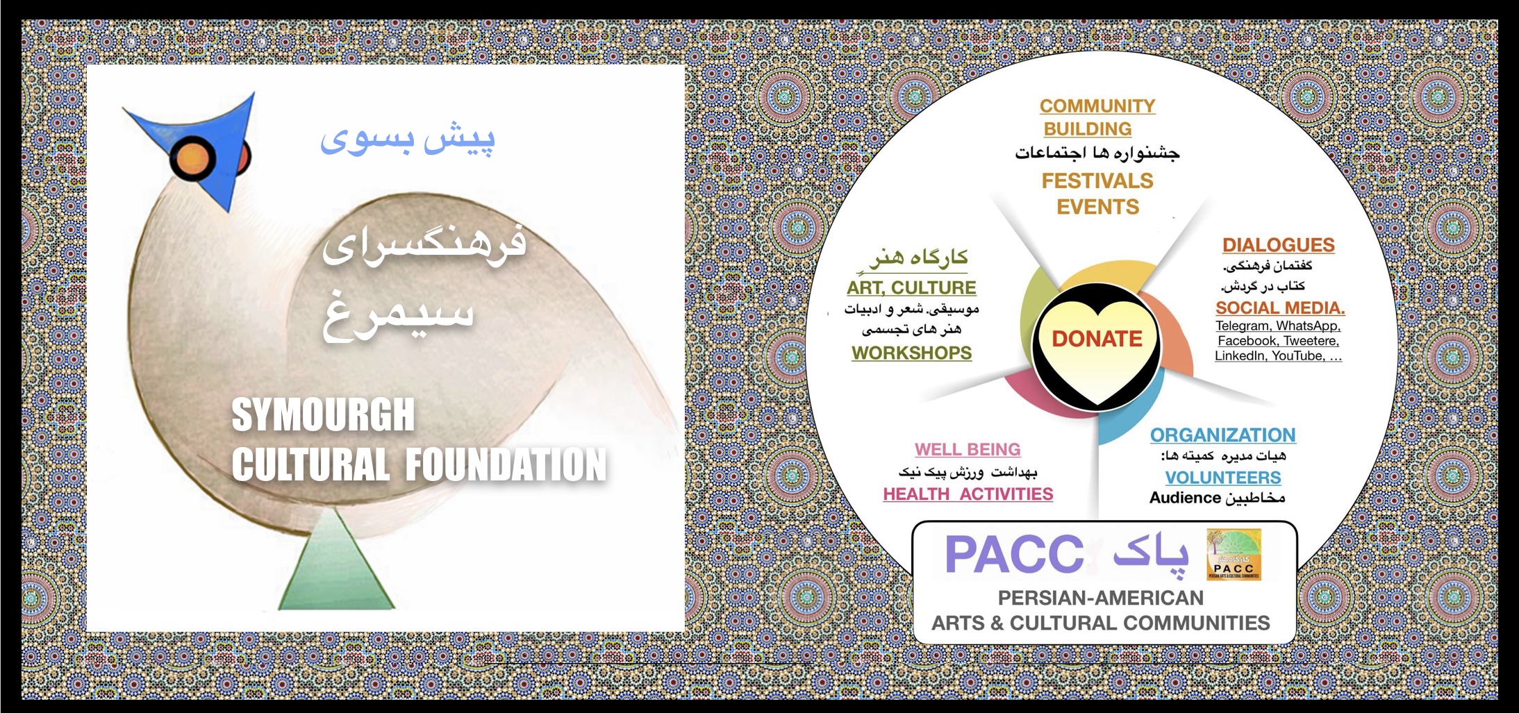 The Persian Arts & Cultural Communities (PACC) is a registered, non-profit organization with a 501 (c)(3) designation from the IRS. PACC’s Persian Arts & Cultural Communities (PACC) exists to strengthen and sustain the legacy of Persian Arts and Culture through community-building and education